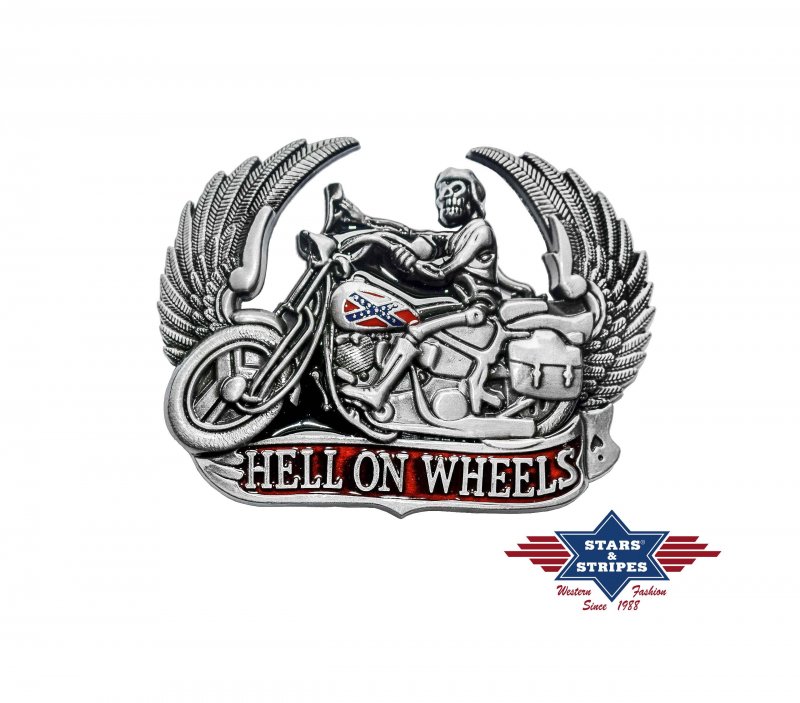 Gürtelschnalle GS-414: Cut-Out Biker Gürtelschnalle mit Emaille Effekten und geschwärztem Hintergrund