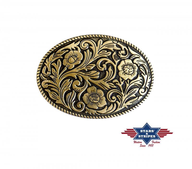 Gürtelschnalle GS-422: Western Gürtelschnalle mit schönen floralen Ornamenten in gold und geschwärztem Hintergrund