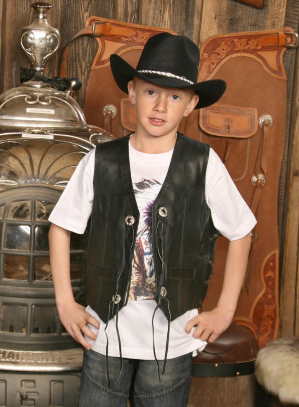 Preis: 42,95 EUR inkl. gesetzl. MwSt. zzgl. Versand Artikelnr.: 1268 nicht lieferbarWeste Billy The Kid: Kinderlederweste aus schwarzem Glattleder. Mit Conchos, zwei Außentaschen und Seitenschnürung.