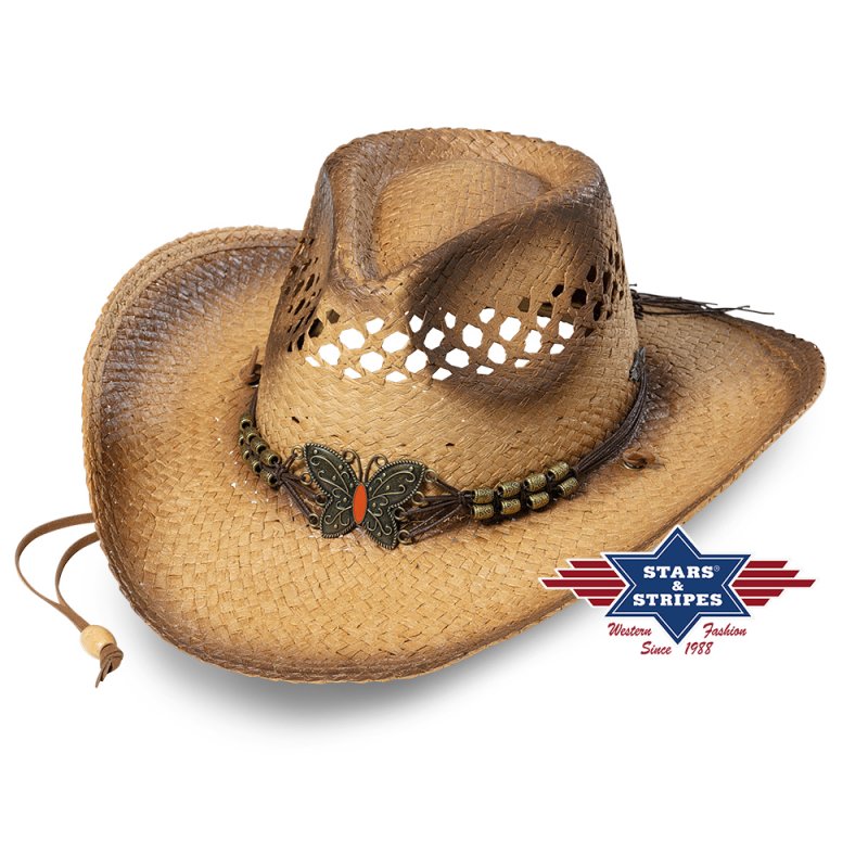 Preis: 31,95 EUR inkl. gesetzl. MwSt. zzgl. Versand Artikelnr.: 2185 nicht lieferbarWesternhut Butterfly: Western Strohhut mit ausgefallener Lochflechtung, die durch eine interessante Einfärbung unterstrichen wird. Das Hutband ist mit einem dekorativen Concho versehen. Mit elastischem Innenband.