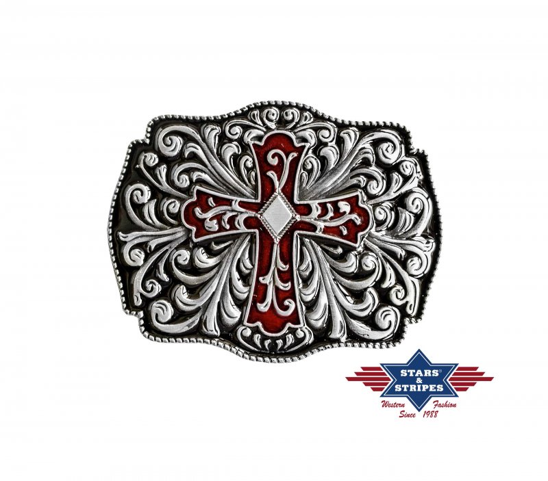Gürtelschnalle GS-415: Schöne Gürtelschnalle mit einem Kreuz auf Ornamenten und Emaille Effekten
