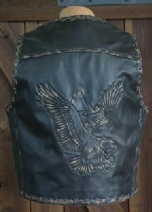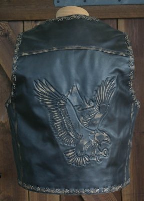 Rindslederweste im klassischen Schnitt. Mit Antikoptik und Adlerprägung auf dem Rücken wird diese Weste zu einem ganz besonderen Kleidungsstück.